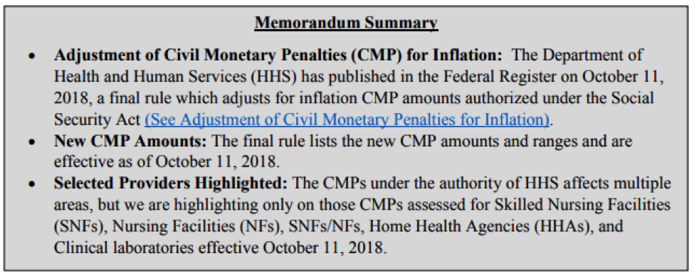 CMS issued a Notice of Final Rule Adjusting Civil Monetary Penalties (CMPs) for Inflation on Tuesday, January 2019.