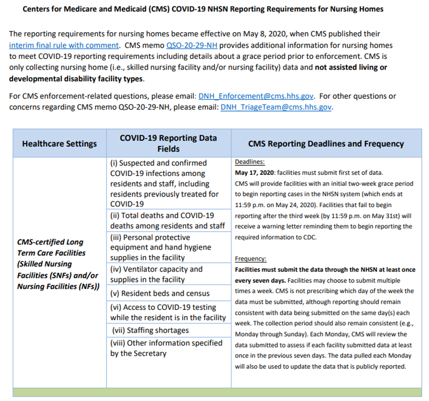 Reporting COVID-19 data supports CMS’s responsibility to protect and ensure the health and safety of residents and is necessary to ensure the appropriate tracking, response, and mitigation of the spread and impact of COVID-19 on our most vulnerable citizens, personnel who care for them, and the general public. The information provided may be used to inform residents, families, and communities of the status of COVID-19 infections in their area. We believe that this action strengthens CMS’s response to the COVID-19 pandemic and reaffirms our commitment to transparency and protecting the health and safety of nursing home residents. CMS anticipates publicly posting CDC’s NHSN data (including facility names, number of COVID-19 suspected and confirmed cases, deaths, and other data as determined appropriate) weekly on https://data.cms.gov/ by the end of May.