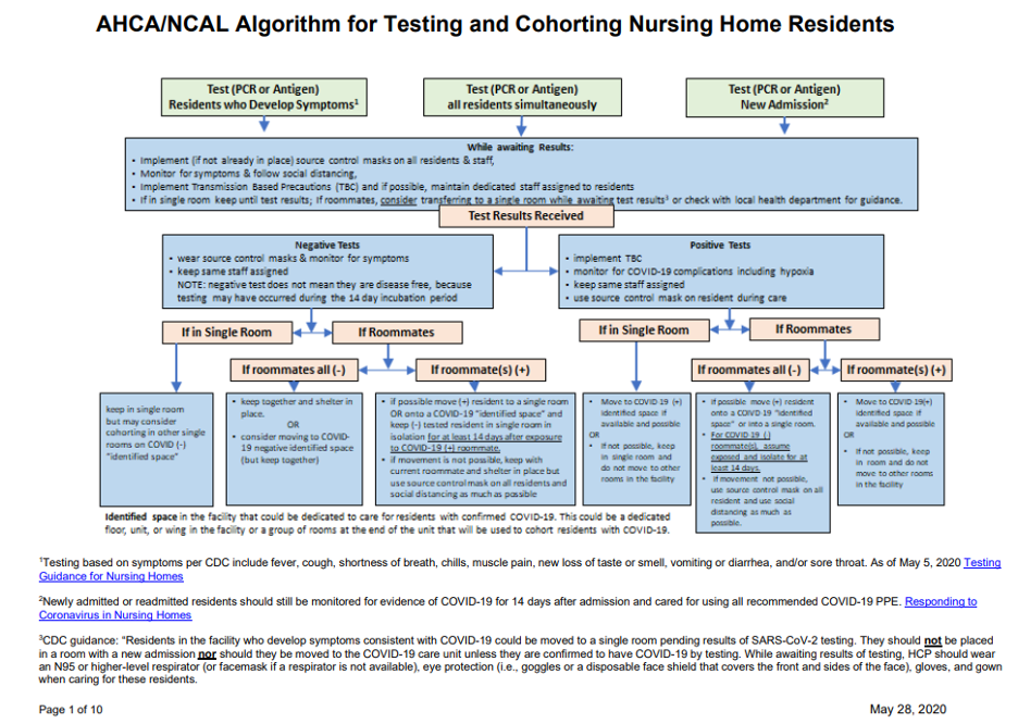 AHCA/NCAL Algorithm for Testing and Cohorting Nursing Home Residents is a 10-page document posted on May 28, 2020. The 1st page is the algorithm with the remaining 9 pages consisting of these CDC guidances: