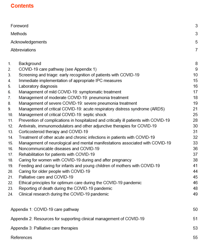 “This guidance document is intended for clinicians caring for COVID-19 patients during all phases of their disease (i.e. screening to discharge). This update has been expanded to meet the needs of front-line clinicians and promotes a multi-disciplinary approach to care for patients with COVID-19, including those with mild, moderate, severe, and critical disease. The following sections are entirely new: COVID-19 care pathway, treatment of acute and chronic infections, management of neurological and mental manifestations, noncommunicable diseases, rehabilitation, palliative care, ethical principles, and reporting of death; while previous chapters have also been significantly expanded.”