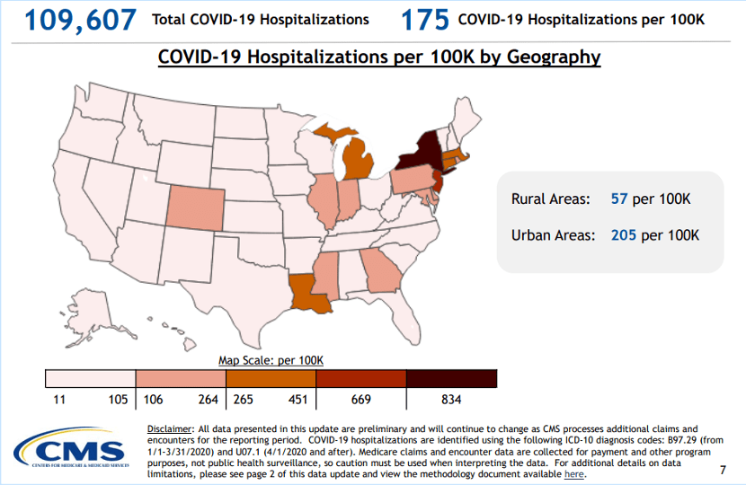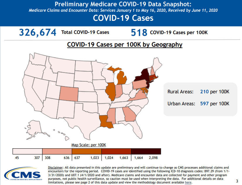 The Preliminary Medicare COVID-19 Data Snapshot has a lot of information regarding Medicare Claims and Encounter Data: Services January 1 to May 16, 2020, Received by June 11, 2020. Scroll down this webpage to view that information (you can also view the info on the 12-page Medicare COVID-19 Data Snapshot Fact Sheet). I’m going to call out a few for your consideration and I encourage you to review all of the data. Be sure to review the disclaimer verbiage for use of this data. The data sources for the Snapshot are Medicare Fee-for-Service (FFS) claims data, Medicare Advantage (MA) encounter data, and Medicare enrollment information.