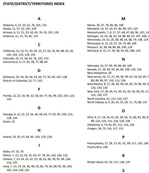 As with the previous 3 versions, there are 15 specific actions that are address from Cleaning/Disinfection to Screening Visitors, Telehealth and the National Guard. I would like to call your attention to 2 specific resources within the Toolkit – the State/District/Territories Index and the Key Words Index. In addition to the specific actions, you can quickly identify what pages your state information is found (this is a random screen grab):