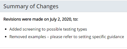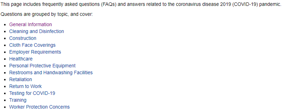 - OSHA COVID-19 Frequently Asked Questions and OSHA New and Updates – Alerts webpages continue to be updated with some updated in June and early July. The first hyperlink has a wealth of FAQs grouped by topic.