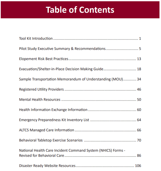 One of the great benefits of the Disaster Ready program and specifically the Pilot Study, was the opportunity for behavioral care facility leaders to network with each other. We encourage you to actively participate in opportunities to meet with your peers in the behavioral arena. Each organization is different, and there is much to be learned through the exchange of ideas and practices.