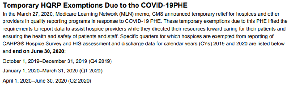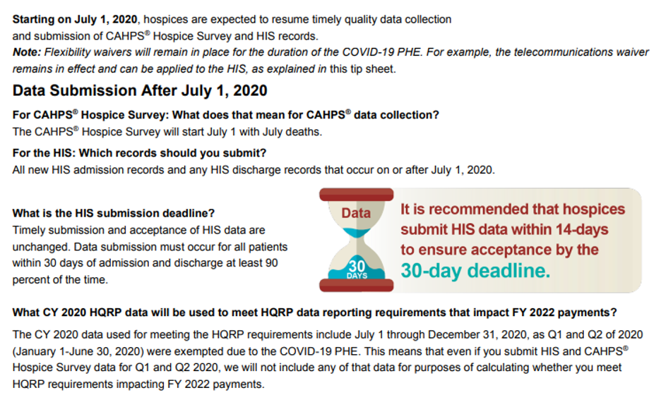 A 4-page Tip Sheet on the Hospice Quality Reporting Program (HQRP): COVID-19 Public Health Emergency (PHE) is available. This tip sheet provides guidance on quality data submissions starting on July 1, 2020, when the temporary exemptions from the COVID-19 PHE end. See the HQRP Requirements and Best Practices webpage for more information.