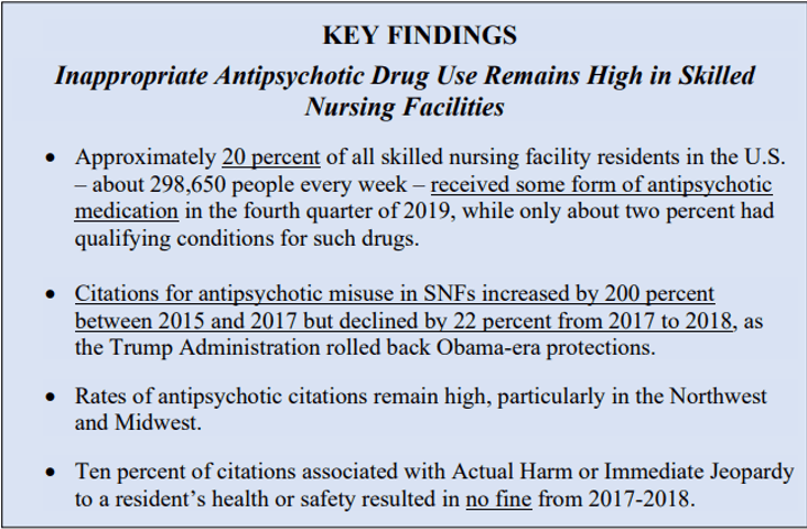 The U.S. House of Representatives’ Ways and Means Committee released Under-Enforced and Over-Prescribed: The Antipsychotic Drug Epidemic Ravaging America’s Nursing Homes on July 27, 2020. This is a 53-page report that merits your attention. These are excerpts from the Executive Summary to whet your interest (bolding added by me):
