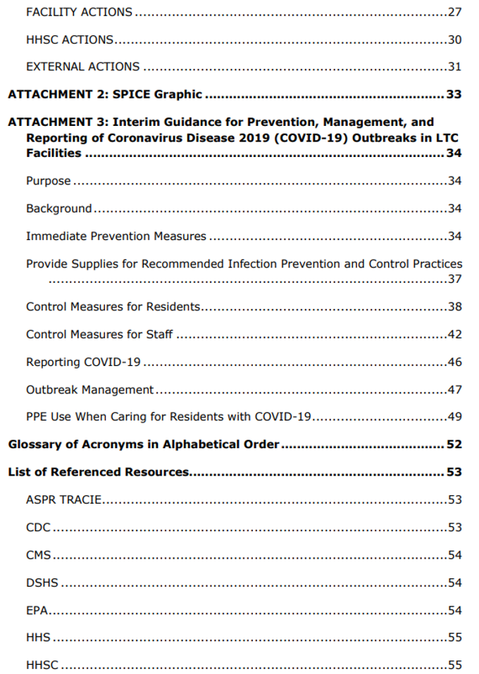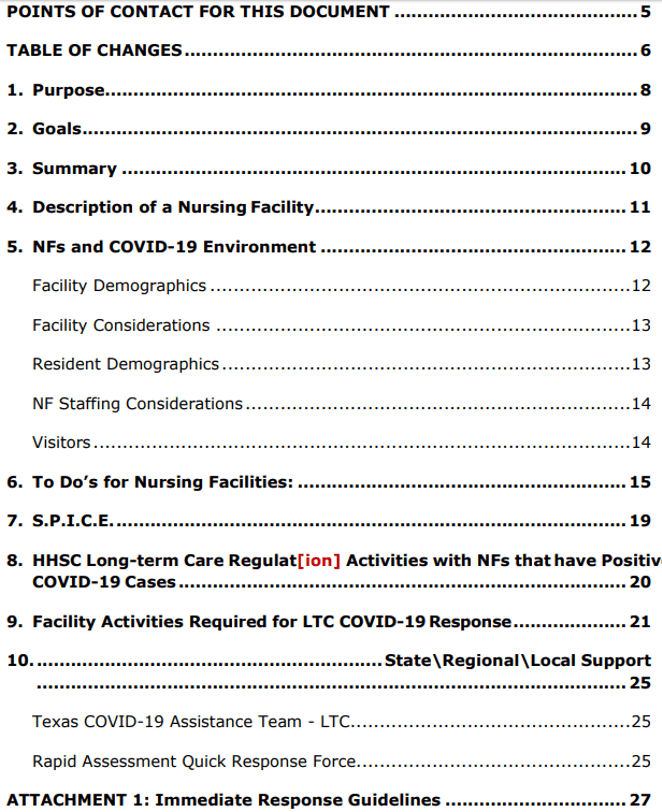 The Texas Health and Human Services Commission has published this document to give nursing homes and skilled nursing facilities guidance in the event a positive COVID-19 case is associated with the facility. This 78-page guide is version 3.3.