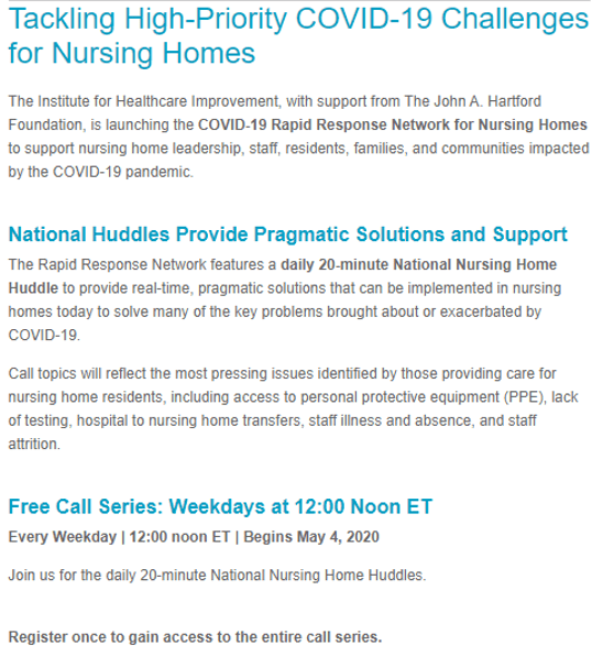 Week 12 of these huddles began August 3, 2020. The topic this week is Supporting Persons Living with Dementia. These huddles have been one of the highlights of my weekdays. They’re short and full of great information. You can also access all recordings, slides, and resources on the landing page. You will need to log into your IHI account to access the page, and only those who are registered for the network will have access. Register for your IHI account at https://my.ihi.org/Portal/rise/Contacts/ihi-create-account/create-account-complete.aspx.