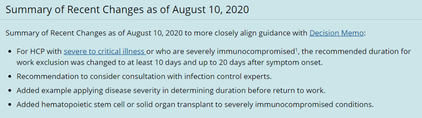 - CDC updated this return to work guidance again on Monday, August 10, 2020.