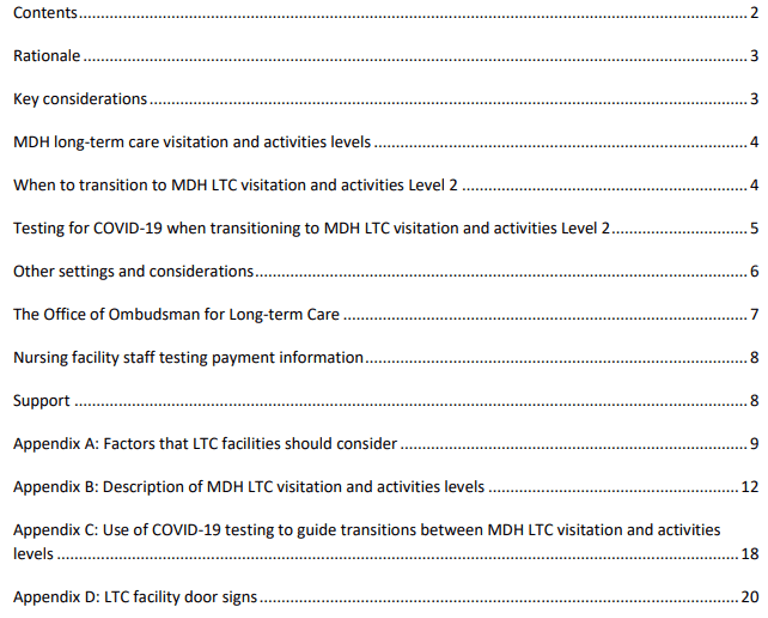 - Recommendations for Long-term Care Visitation and Activities: How and When to Safely Transition to the Next Level Throughout the COVID-19 Pandemic. “The Minnesota Department of Health (MDH) has outlined levels for visitation and activities to guide long-term care (LTC) facilities in Minnesota in adjusting restrictions while maintaining high standards for COVID-19 safety for residents, staff, and visitors. This (22-page) document combines current guidance from the Centers for Disease Control and Prevention (CDC), the Centers for Medicare & Medicaid Services (CMS), and MDH. This document should be reviewed and implemented in conjunction with all other federal and state guidance documents from the CDC, CMS, and MDH.” This document was posted on August 10, 2020; it is effective August. 29, 2020. Here’s a look at the table of contents: