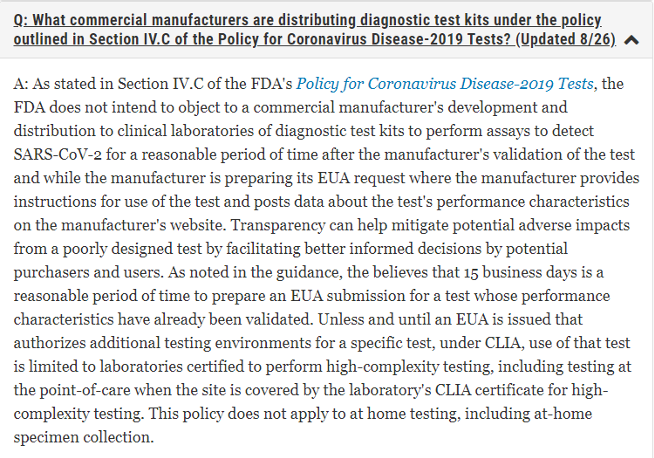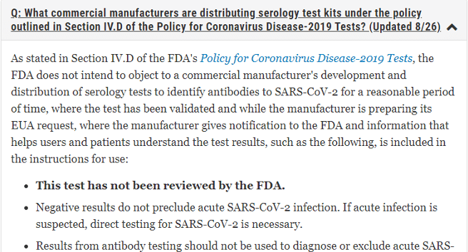 The Food and Drug Administration (FDA) has updated the FAQs on Testing for SARS-CoV-2 website. There’s a lot of information on this website – scroll down that page to find the FAQs. There are two that were updated on August 26, 2020. I’m going to show just a snippet of each so make sure to go on to that website and read each in full: