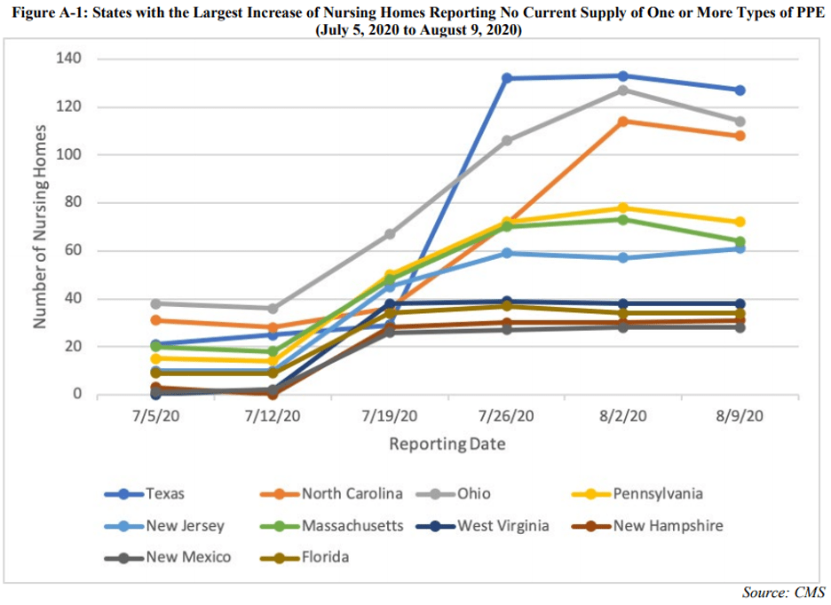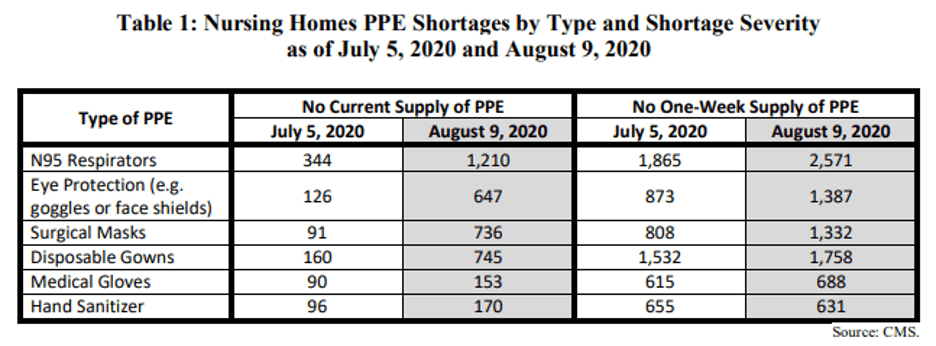 “Nursing homes and other congregate settings have been at the epicenter of the COVID-19 pandemic since the beginning. According to media reports, more than 70,000 nursing home residents and workers have lost their lives to COVID-19, and more than 420,000 have been infected. Moreover, Federal data show that there are now more nursing home residents currently infected with COVID-19 than there were at the end May, making the persistent and increasing prevalence of PPE shortages in nursing homes all the more alarming. Researchers have found that PPE shortages have resulted in health care workers unnecessarily contracting COVID-19. PPE shortages also contribute to reductions in available health care services, as providers strive to preserve limited PPE supplies, putting additional strain on an already overloaded system. With supply shortages worsening, nursing home residents and workers are under growing threat from COVID-19.” (The letter contains the references to the data cited.)