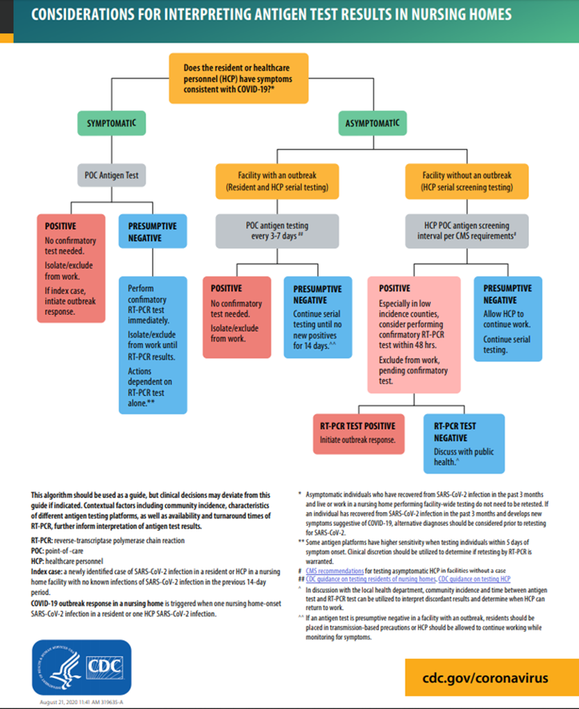 CDC has also developed a printable algorithm that visually proceeds through the considerations for testing asymptomatic and symptomatic residents or HCP. It also provides clarification for when, and if, a confirmatory RT-PCR test is needed. Please note, this algorithm should be used as a guide, but clinical decisions may deviate from this guide if indicated.