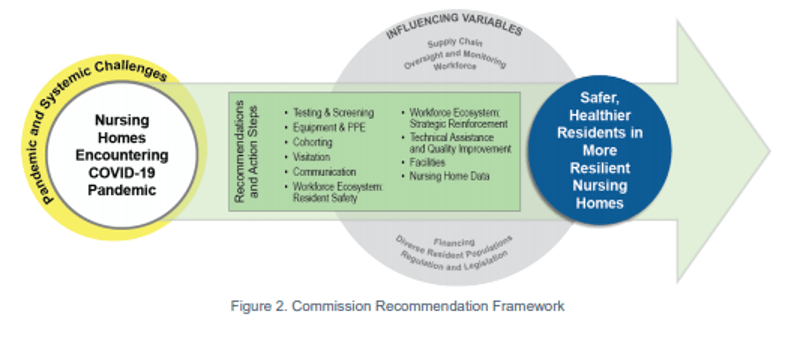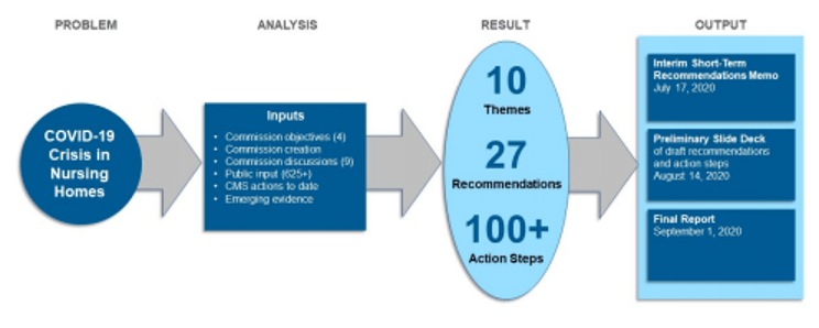 The 25 Commission members hailed from around the country with diverse expertise and viewpoints ranging from nursing home resident, consumer advocates, and nursing home owners and administrators to infectious disease experts, academicians, state authorities, and others. The Commission convened nine times between June 23 and August 19. The Commission used the four objectives provided by CMS and its collective knowledge of the nursing home system, to frame its discussions. Analysis of public input solicited via the Commission’s website and discussion of relevant CMS and other federal actions to date also informed the Commission’s work. Figure 1 illustrates the Commission process and outputs.
