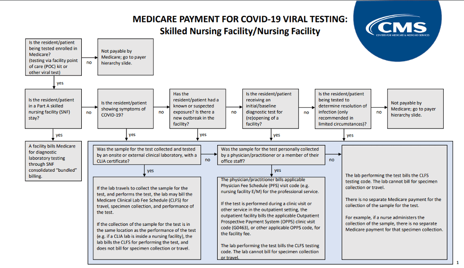 Today (September 18, 2020), the Centers for Medicare and Medicaid Services (CMS) released information to help states, nursing facilities, and other providers better understand the sources of Medicare and Medicaid coverage and payment for COVID-19 testing, including a flow chart detailing testing coverage for nursing facility residents. We encourage you to review.