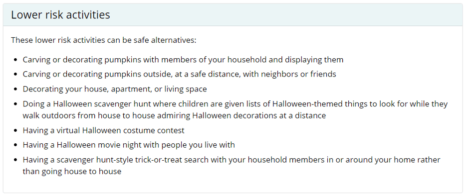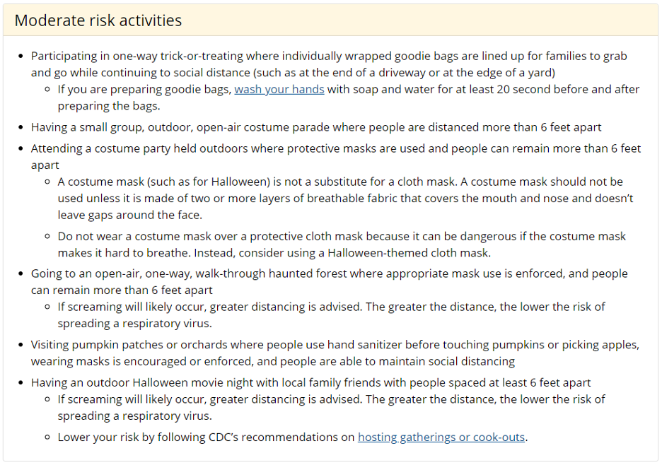 CDC has identified different groups of Halloween activities based on risk (see below for those charts from the guidance). I strongly encourage you to start working with your staff, residents and families on ways you can enjoy Halloween as well as the other upcoming holidays in 2020 and early 2021. Lives will depend on how you manage the next several months.