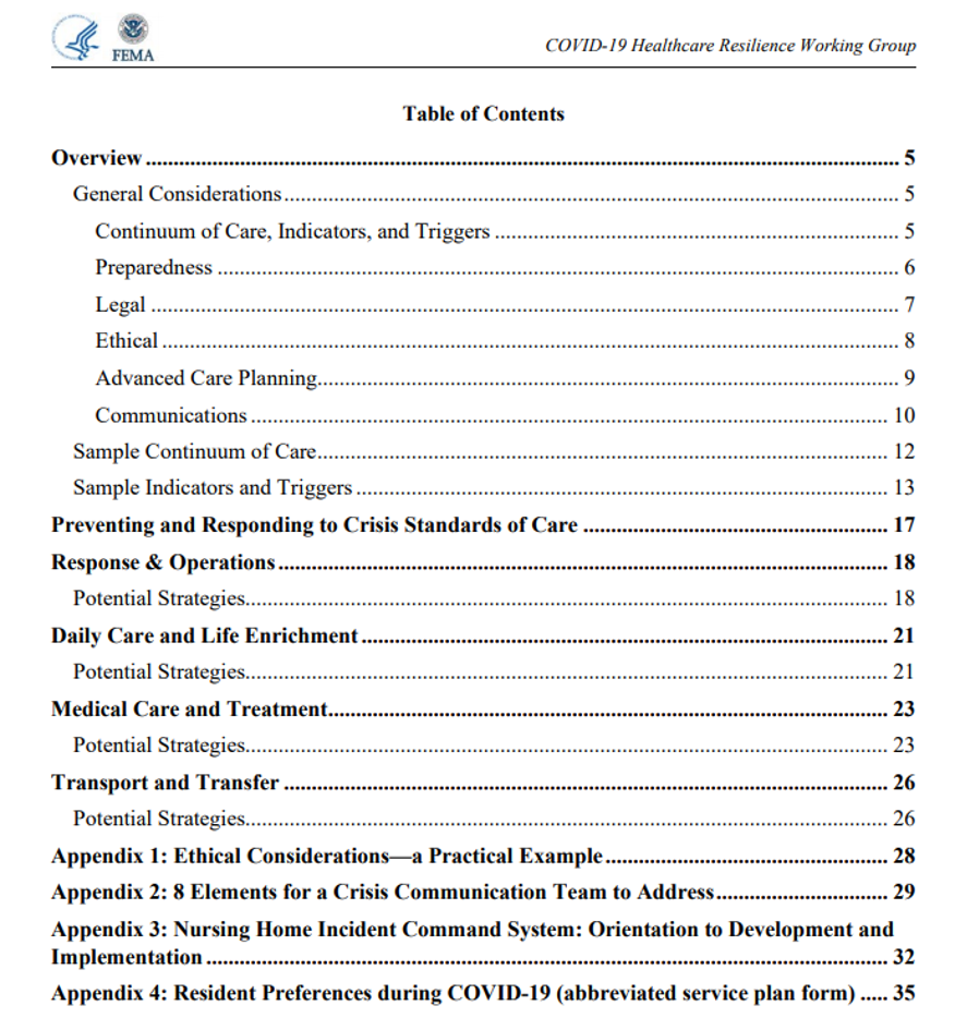 A new report from the federal COVID-19 Healthcare Resilience Working Group, COVID-19: Considerations, Strategies, and Resources for Crisis Standards of Care in Post-Acute and Long-Term Care (LTC) Facilities, says that PALTC facilities need to adjust operations and standards of care in order to preserve and effectively allocate limited facility and system resources.