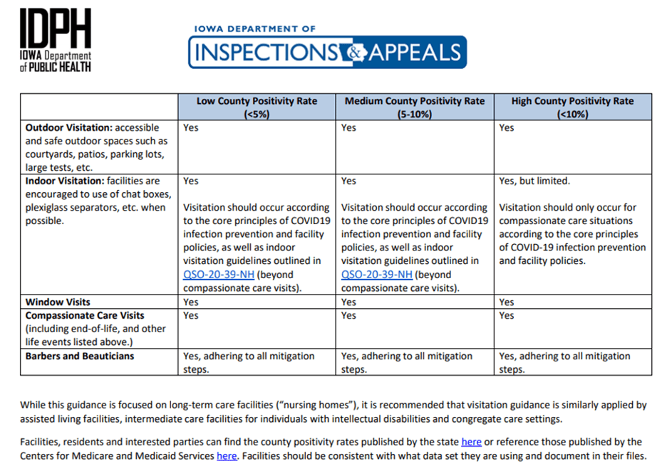 The Iowa Department of Public Health (IDPH) and the Iowa Department of Inspections and Appeals (DIA) are updating guidance for long-term care facilities to comply with new requirements from the Centers for Medicare and Medicaid Services (CMS). This updated guidance aligns with federal regulations to balance resident and staff safety with quality of life.