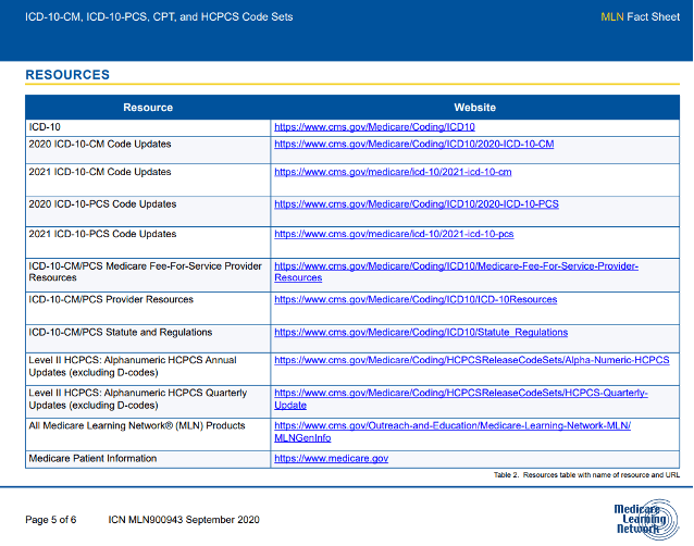 I just ran across this great updated (September 2020) MLN Fact Sheet. This 6-page educational tool gives health care providers, suppliers, medical coders, billing and claims staff an easy reference to information on the code sets used to bill Medicare claims. Use this tool when submitting inpatient and outpatient diagnoses, procedures, and supplies on Medicare claims. This is a resource to keep for future reference.