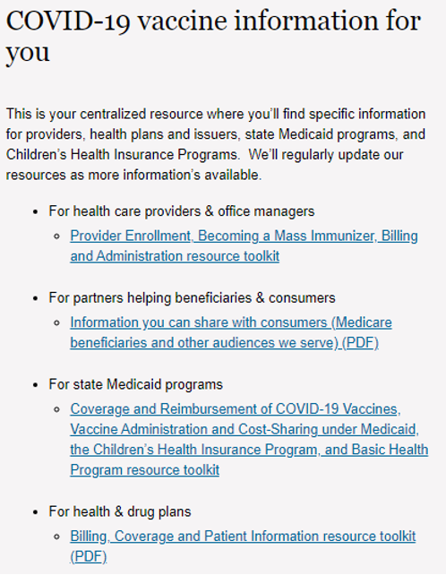 Along with these regulatory changes, CMS is issuing three toolkits aimed at state Medicaid agencies, providers who will administer the vaccine, and health insurance plans. Together, these toolkits will help ensure the health care system is prepared to successfully administer a safe and effective vaccine by addressing issues related to access, billing and payment, and coverage.