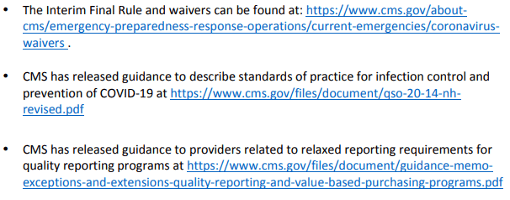 “Since the beginning of the COVID-19 Public Health Emergency, the Trump Administration has issued an unprecedented array of temporary regulatory waivers and new rules to equip the American healthcare system with maximum flexibility to respond to the 2019 Novel Coronavirus (COVID-19) pandemic. These temporary changes will apply immediately across the entire U.S. healthcare system for the duration of the emergency declaration. The goals of these actions are to 1) expand the healthcare system workforce by removing barriers for physicians, nurses, and other clinicians to be readily hired from the community or from other states; 2) ensure that local hospitals and health systems have the capacity to handle a potential surge of COVID-19 patients through temporary expansion sites (also known as CMS Hospital Without Walls); 3) increase access to telehealth in Medicare to ensure patients have access to physicians and other clinicians while keeping patients safe at home; 4) expand in-place testing to allow for more testing at home or in community based settings; and 5) put Patients Over Paperwork to give temporary relief from many paperwork, reporting and audit requirements so providers, health care facilities, Medicare Advantage and Part D plans, and States can focus on providing needed care to Medicare and Medicaid beneficiaries affected by COVID-19.”