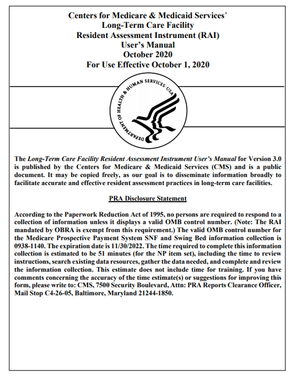 The posting of the page I found late last week was only the required renewal of the PRA – Paperwork Reduction Act of 1995. In effect, the combination of the PRA Disclosure Statement and the October 2020 – For Use Effective October 1, 2020 statement tells providers that the October 2019 RAI User’s Manual is the October 2020 RAI User’s Manual.