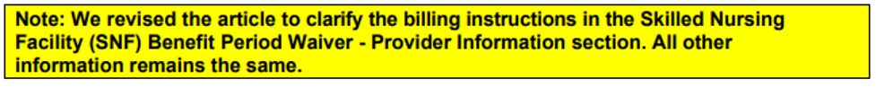 Pages 14 through 16 speak to clarification of SNF billing instructions as noted above. You’ll easily spot the red ink on those pages. Page 13 begins the section on Skilled Nursing Facility (SNF) Benefit Period Waiver – Provider Information.