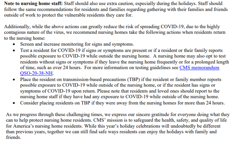 A copy of the press release can be found here: https://www.cms.gov/newsroom/press-releases/cms-urging-nursing-homes-follow-established-covid-guidelines-holiday-season