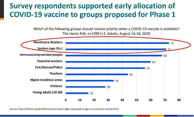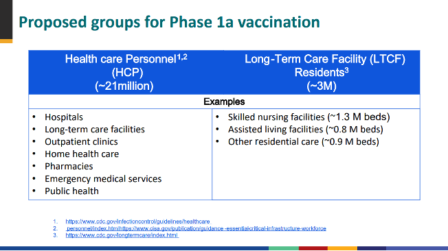 When a COVID-19 vaccine is authorized by FDA and recommended by ACIP, vaccination in the initial phase of the COVID-19 vaccination program (Phase 1a) should be offered to both 1) health care personnel§ and 2) residents of long-term care facilities¶