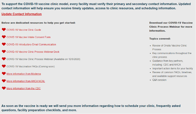 I strongly encourage you/your team to bookmark this webpage and begin your preparations for administration of the vaccine to your employees, residents, etc.