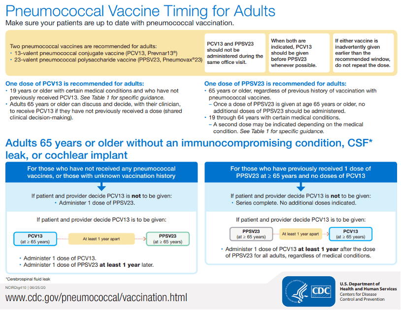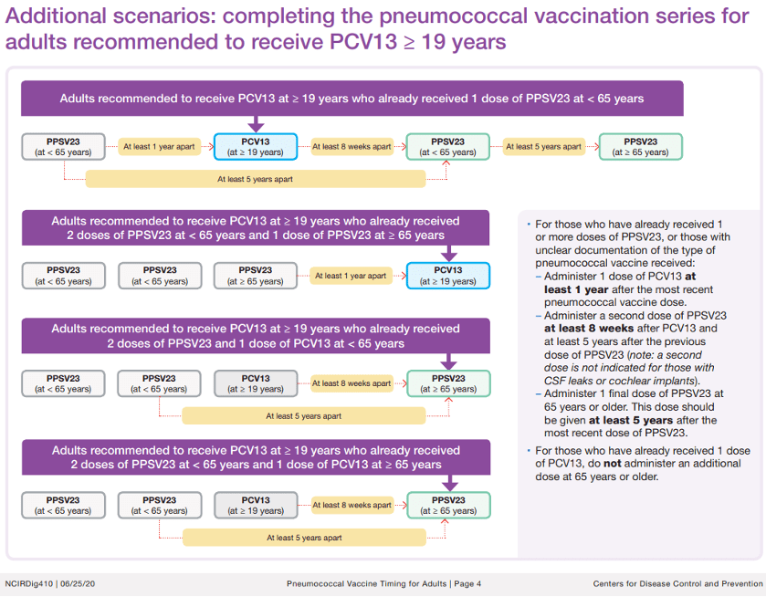 The CDC has an updated visual resource to help you with Pneumococcal Vaccine Timing for Adults. This is a 4-page resource that was updated June 25, 2020. Here’s what the first and last pages look like: