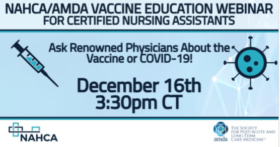 This educational webinar is hosted by the National Association of Health Care Assistants (NAHCA) and AMDA. CNAs and other frontline staff will learn about COVID-19 in LTC and the COVID-19 vaccine. An interactive Q&A with attendees and panelists will follow the webinar.