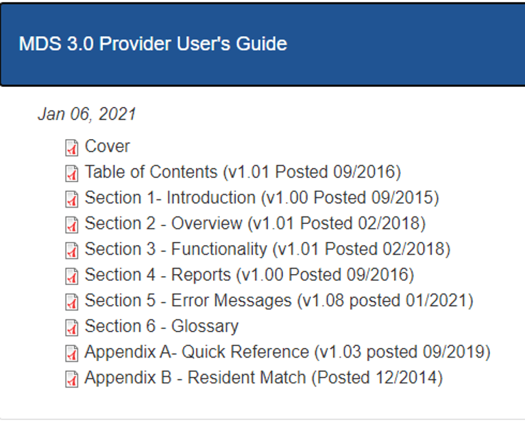Here’s the Table of Contents for the MDS 3.0 Provider’s Guide: