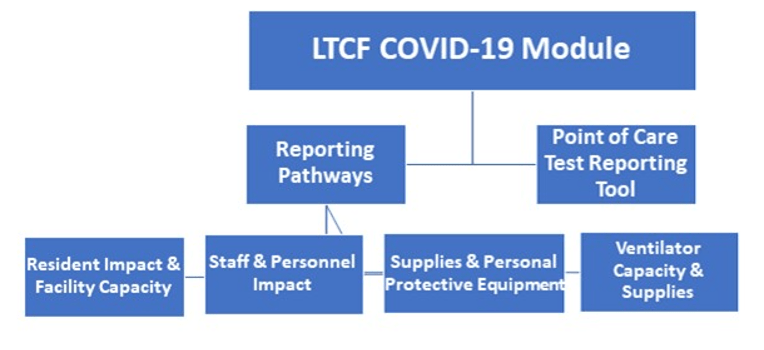The LTCF COVID-19 Module homepage also contains updated information, including the addition of Point of Care Test Reporting tool to the existing 4 pathways: