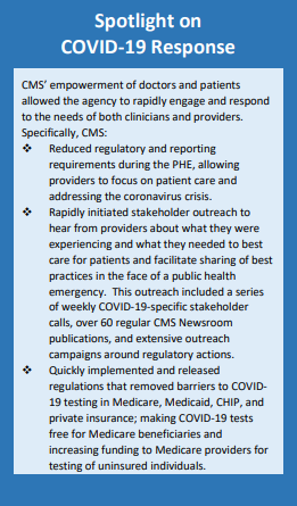 The report examines CMS’ accomplishments over the last four years, highlighting agency actions that responded to the coronavirus disease 2019 (COVID-19) pandemic and furthered CMS’s Four Core Goals identified in 2017: empowering patients and doctors, ushering in a new era of state flexibility and local leadership, developing innovative approaches, and improving the CMS customer service experience.