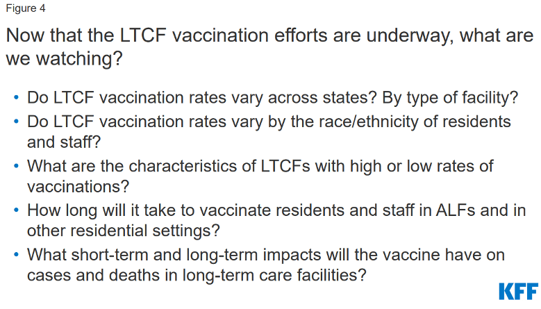 I listened in to the Kaiser Family Foundation webinar A Shot in the Arm for LTC Facilities? Early Lessons from the COVID-19 Vaccine Rollout to High Priority Populations on January 14, 2021 and it was well worth the time. The hyperlink in the previous sentence will take you to that recording. The slides are also found on that link as well as here. There are 8 data and info slides. The panel discussion that followed was valuable.