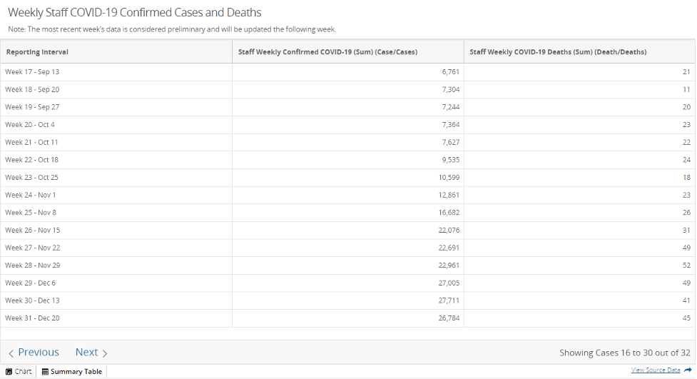 You’ll find this when you open the Summary Table (I used the Next option to show the last several weeks of data for staff cases and death):