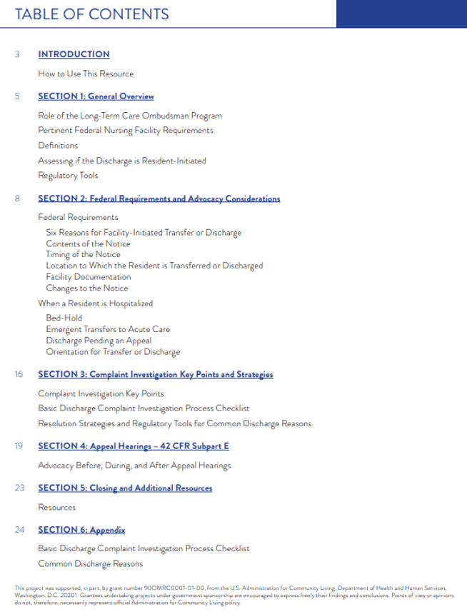 “Complaints regarding nursing facility-initiated discharges have been the most common type of complaint received by the Long-Term Care Ombudsman program for the last nine years. In 2019, 10,508 of the 142,051 nursing facility complaints were about discharges. According to federal guidance for surveyors, “facility-initiated discharge” is defined as “a transfer or discharge which the resident objects to, did not originate through a resident’s verbal or written request, and/or is not in alignment with the resident’s stated goals for care and preferences.” The purpose of this resource is to assist Ombudsman programs when advocating for residents facing a facility-initiated discharge.”