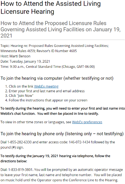 If you would like to attend the Proposed Licensure Rules Governing Assisted Living Facilities hearing on January 19 and 20, please see instructions on how to do so at How to Attend the Assisted Living Licensure Hearing.