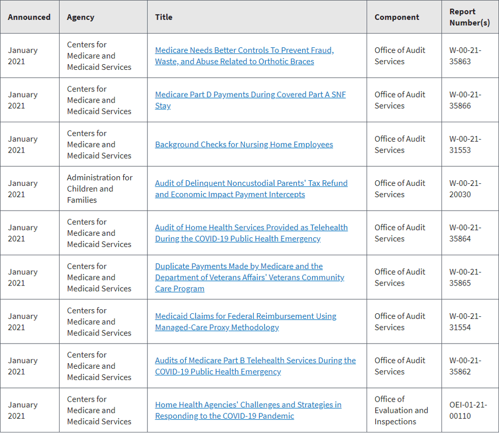 OIG updates this dynamic, web-based Work Plan monthly to ensure that it more closely aligns with the work planning process. The monthly update includes the addition of newly initiated Work Plan items, which can be found on the Recently Added Items page. Beginning in January 2020, completed Work Plan items will remain in the active Work Plan for one month, after which they will be moved into the Archive. Recently completed reports can be found on OIG’s What’s New page. This web-based Work Plan will evolve as OIG continues to pursue complete, accurate, and timely public updates regarding our planned, ongoing, and published work.