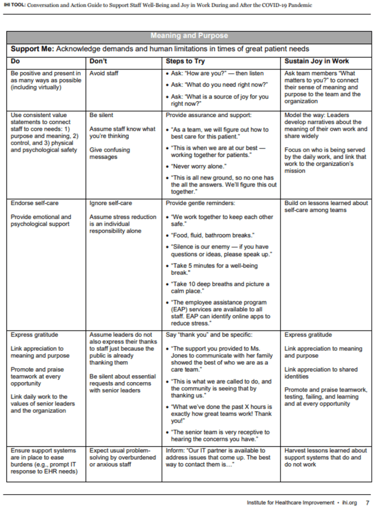 This guide — which builds on the IHI Framework for Improving Joy in Work — includes actionable ideas that leaders can quickly test during the coronavirus response, and which can build the longer-term foundation to sustain joy in work for the health care workforce.