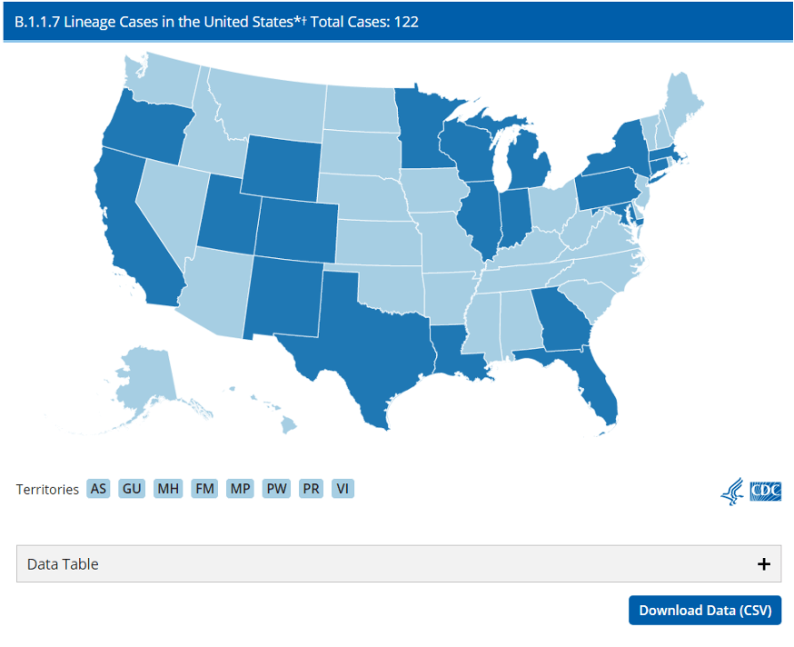 *The cases identified above are based on a sampling of SARS-CoV-2-positive specimens and do not represent the total number of B.1.1.7 lineage cases that may be circulating in the United States and may not match numbers reported by states, territories, tribes, and local officials.