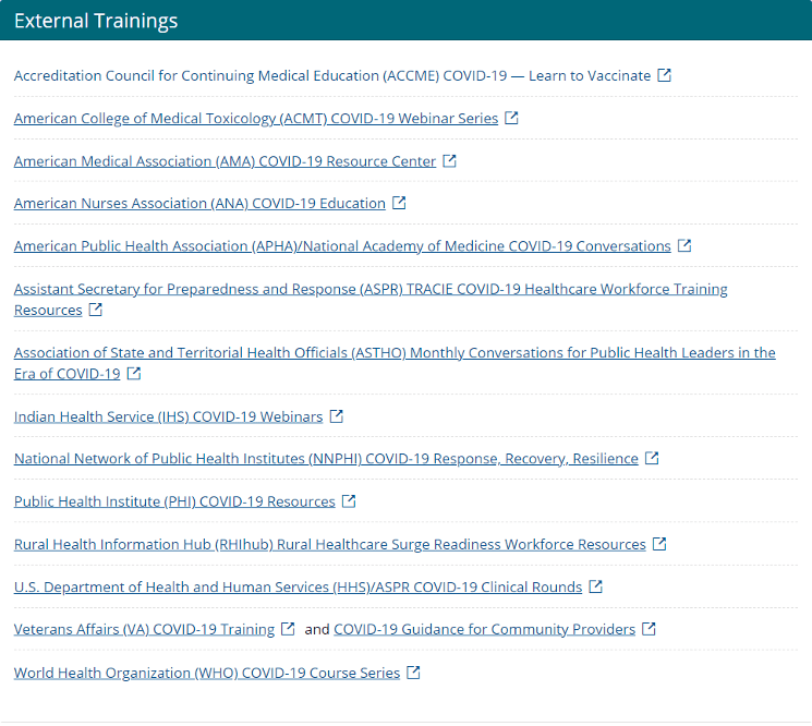 If you’re looking for COVID-19 training resources, here’s a place to start. Training for Healthcare Professionals is a website that identifies many training options. CDC updates this resource periodically – most recently on January 25, 2021.