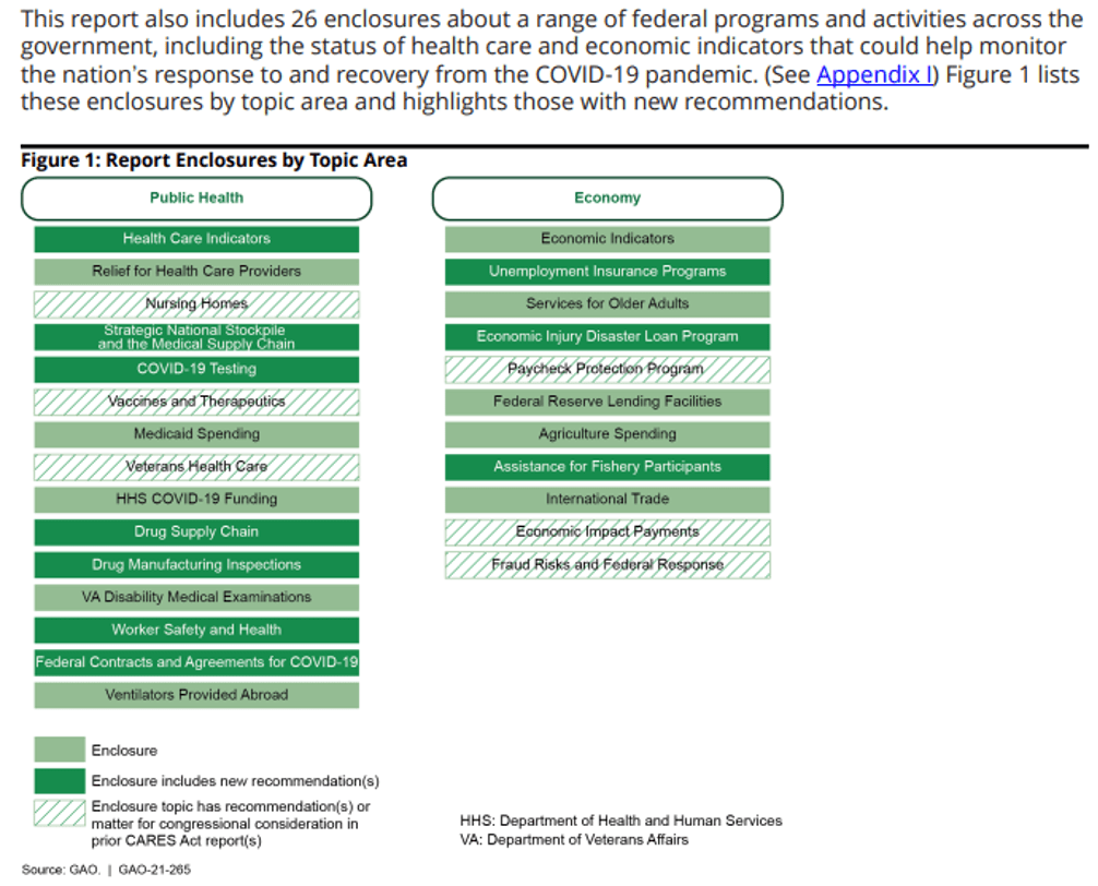 The GAO Press Release issued January 28, 2021 coincides with “its fifth comprehensive report examining the ongoing implementation of the CARES Act and other pandemic relief measures in response to our nation’s continued effort to combat the COVID-19 pandemic.