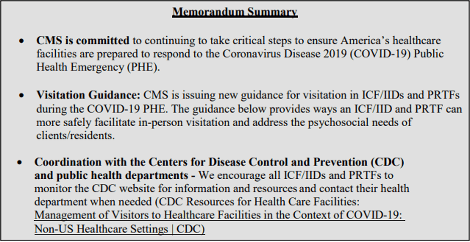 One thought on “CMS Updates Visitation at ICF/IIDs and PRTFs During Public Health Emergency”