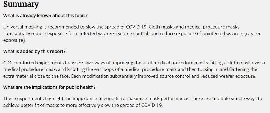 On February 10, 2021, MMWR (Morbidity and Mortality Weekly Report) posted an early release of Maximizing Fit for Cloth and Medical Procedure Masks to Improve Performance and Reduce SARS-CoV-2 Transmission and Exposure.