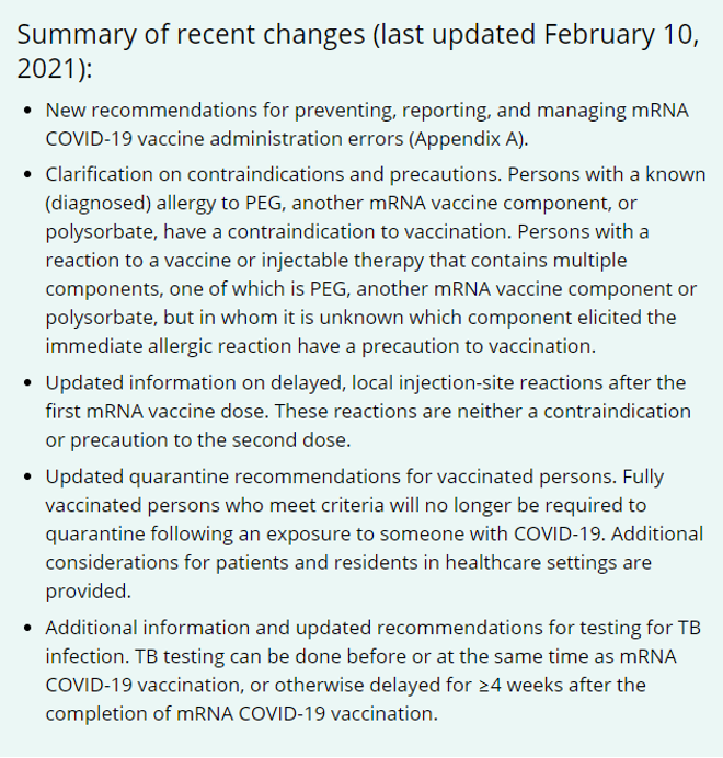 On February 10, 2021, CDC updated Interim Clinical Considerations for Use of mRNA COVID-19 Vaccines Currently Authorized in the United States.