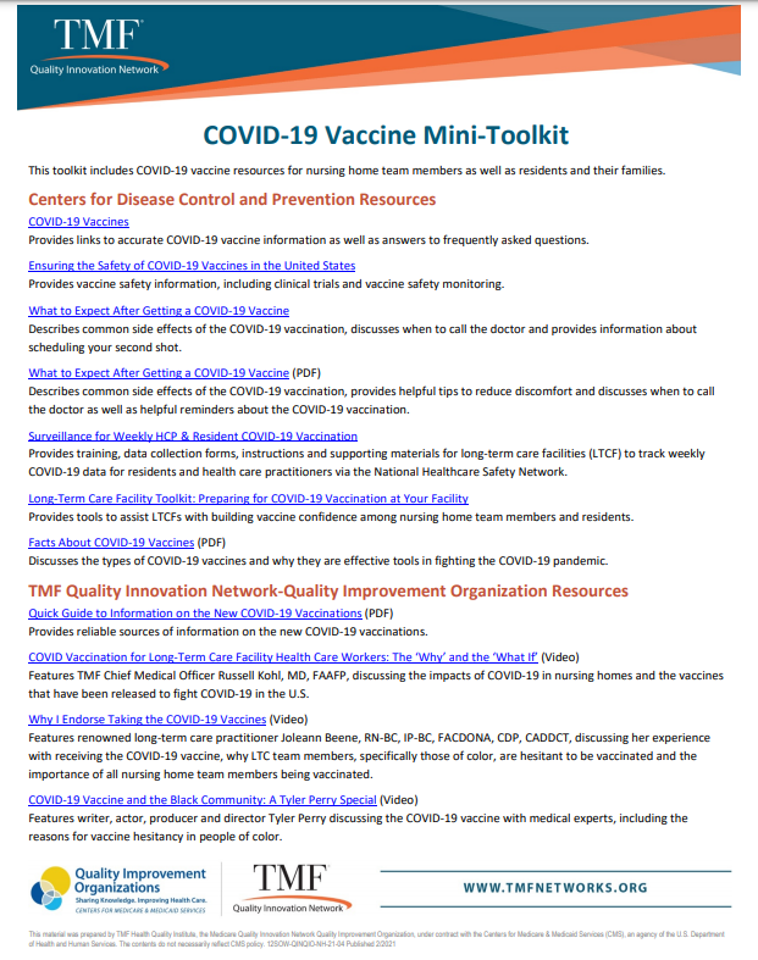 COVID-19 Vaccine Mini-Toolkit is a great resource for information pertinent to the administration of the vaccine to LTC residents, their families and staff. It includes links to CDC resources as well as TMF Quality Innovation Network-Quality Improvement Organization Resources. I encourage you to check it out!