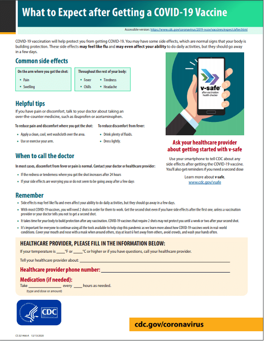 What to Expect After Getting a COVID-19 Vaccine was updated February 23, 2021. This website provides a lot of information, particularly for the consumer, including: