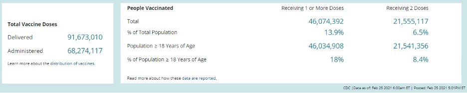 CDC has posted COVID-19 data, including vaccinationsas of 5pm (ET) February 25, 2021: